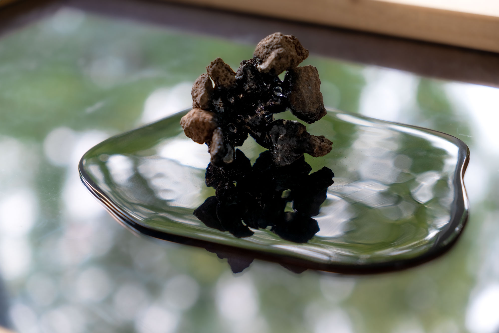 Recovered and melted volcanic stones, obsidian and copper pipes.