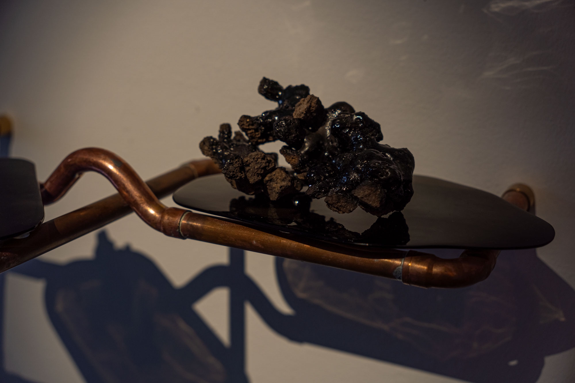 Obsidian is a crystallized volcanic stone. It is produced when lava comes out of a volcano and cools rapidly, crystallizing. It was widely used in Mesoamerica in knives, weapons and parts of deities. This series of Lavas dialogues with finely polished obsidian from Mexico.